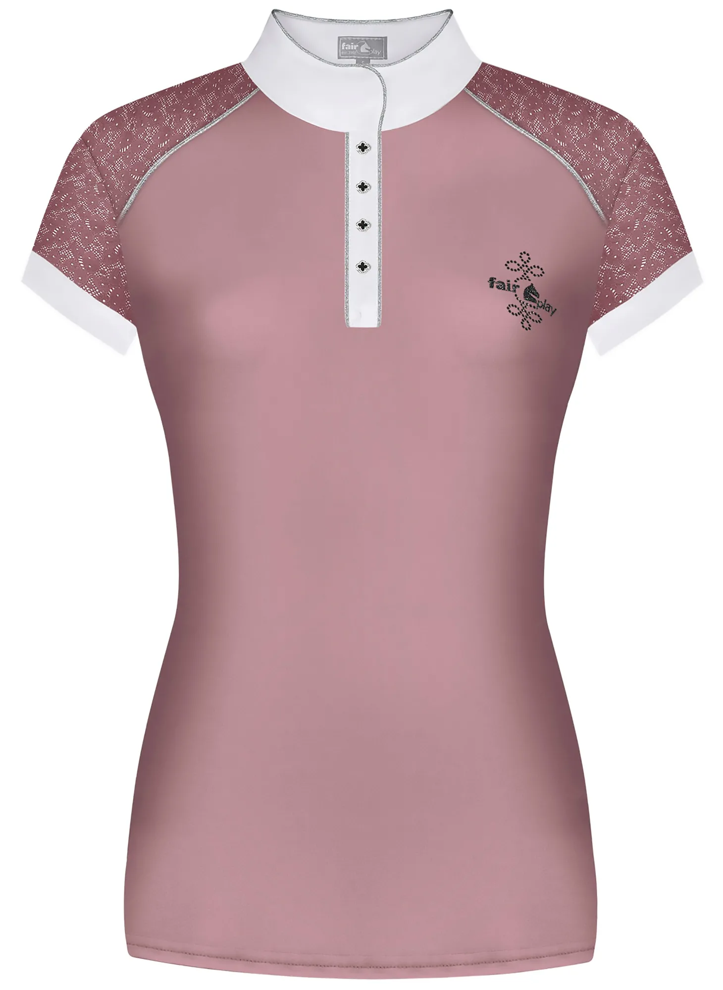 Elastic lace on the sleeves and front and back shoulders is a feminine touch that also adds airflow. Shimmering piping trims the collar, four-button placket and front shoulders. This competition top is proudly made in Poland and suited for formal lessons and clinics as well as shows.