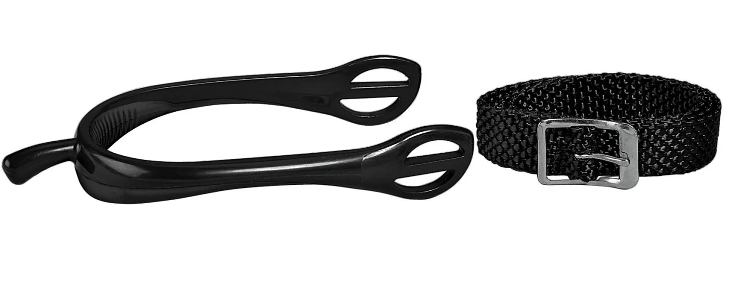 Flexi Spurs stretch to fit over most riding boots to eliminate painful rubs and pressure points. Made from a durable polymer (non-metal) material, each spur has a nonslip surface on the inside so it stays put without scratching boots. Versatile 1/2″ plastic Prince of Wales ends. This Flexi Spur Set includes two spurs and two 18″ nylon straps.