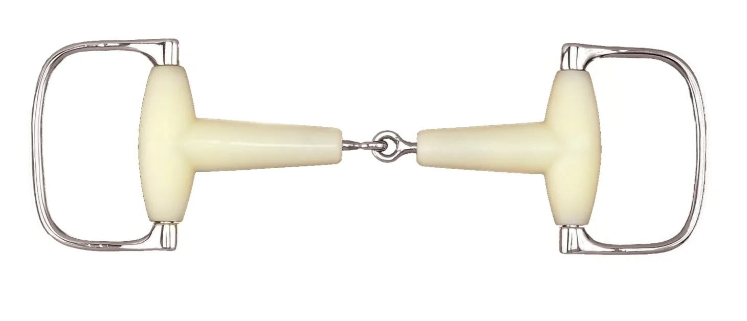 The Happy Mouth Bits® Jointed Racing Dee Bit features a mouthpiece covered in a soft, flexible, yet extremely durable, apple-scented plastic. It encourages bit acceptance and softness. The single-jointed mouthpiece core and rings are stainless steel. The racing dee rings, slightly smaller than king dee rings, offer slight lateral guidance and help prevent the bit from sliding sideways in the horse’s mouth.
