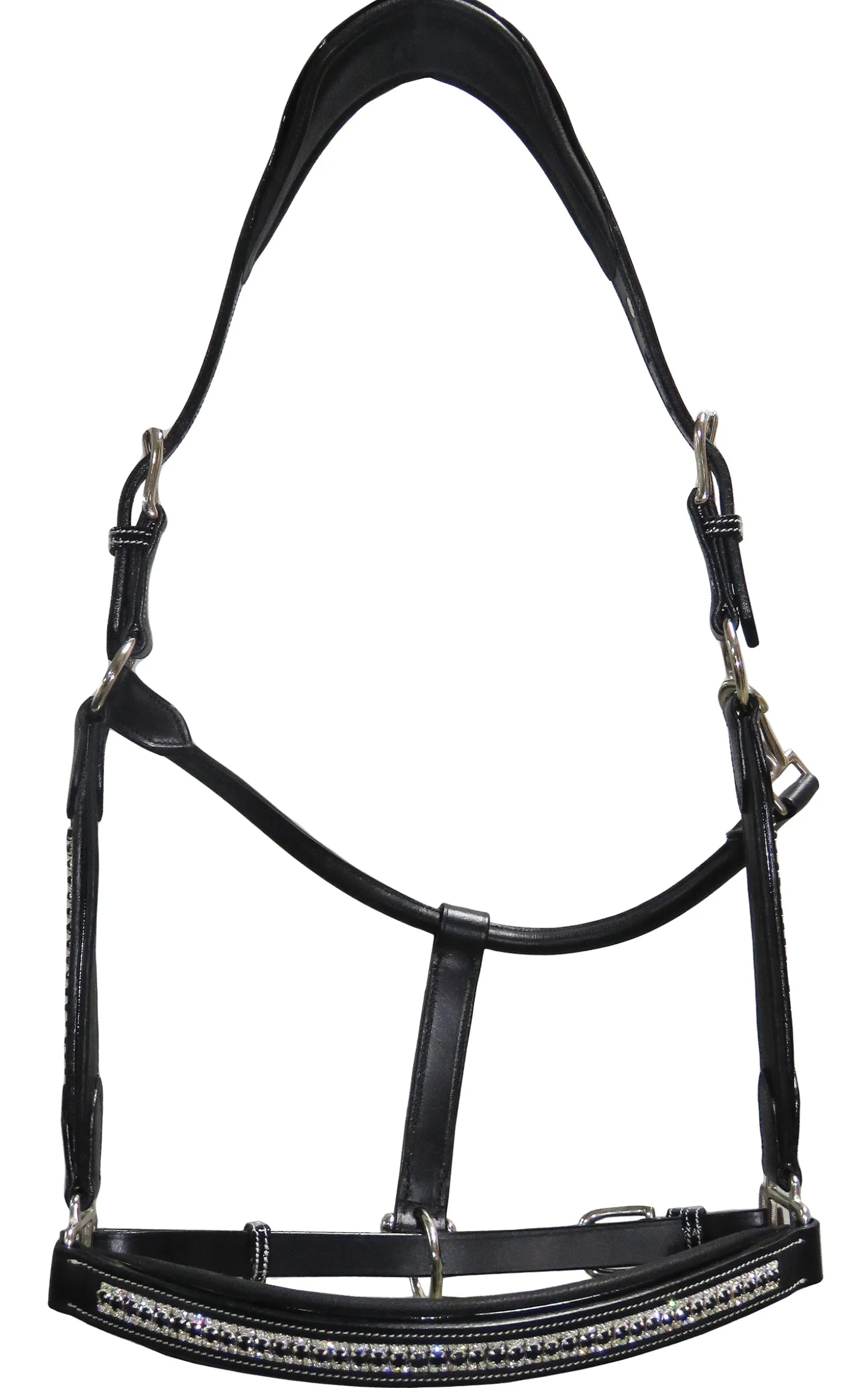 The Padded Jewel Halter by Henri de Rivel shows off your sense of fashionable style. Made of soft, high-quality leather, this eye-catching halter features three rows of crystals on the nose and cheeks accented by patent leather piping. Luxuriously padded for horse comfort, it has a two-buckle crown, adjustable chin and rolled throat with snap closure. Fitted with long-wearing stainless steel hardware throughout.