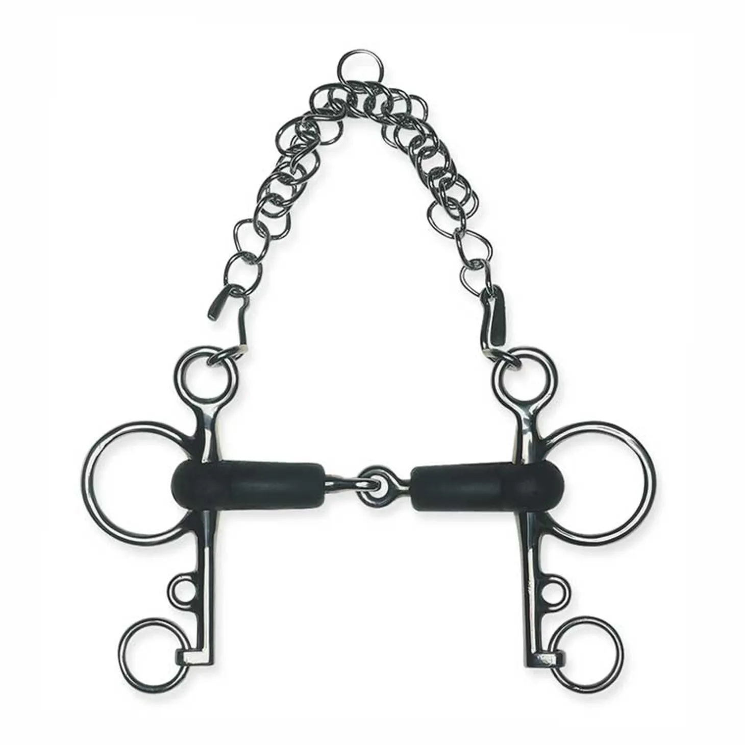 The Metalab Solid Jointed Rubber Pelham is a Level 3 bit made of stainless steel. Rubber mouthpiece. Cheeks are 5 1/2″.
