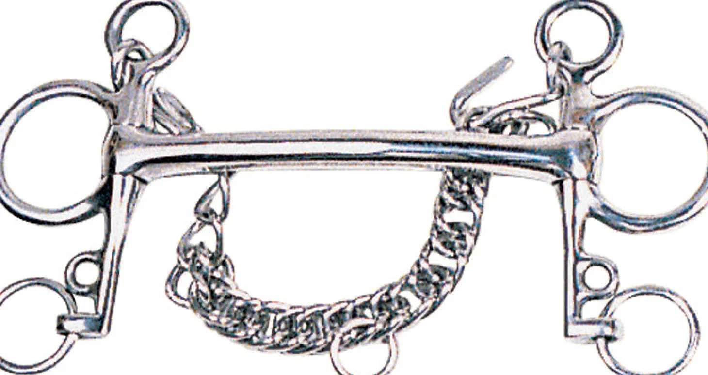 The Mullen Mouth Tom Thumb Pelham Bit in stainless steel has 4″ cheeks and includes curb chain and hooks. This bit design places even pressure on the mouth, lips and bars and exerts some leverage.