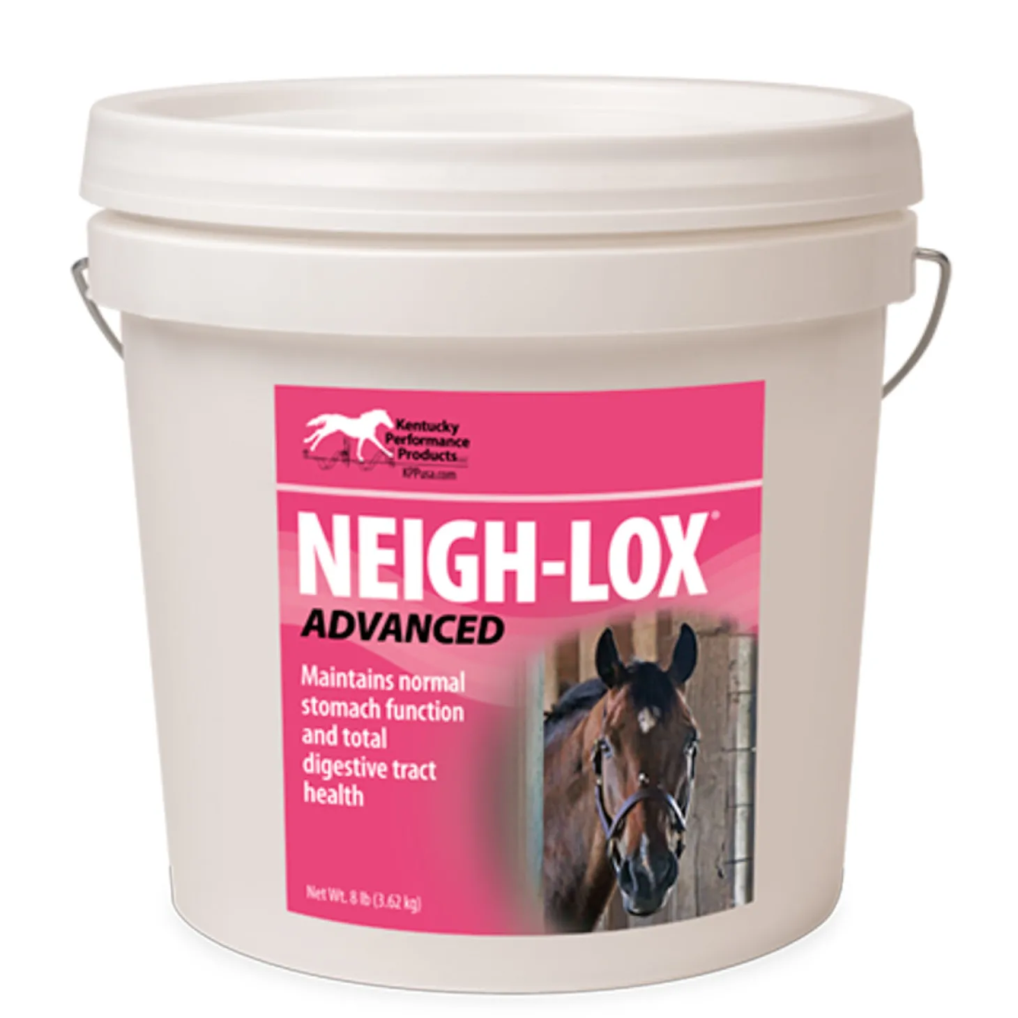 Neigh-Lox® Advanced from Kentucky Performance Products has a blend of ingredients that work to maintain normal digestive functioning in all classes of horses. In a palatable pellet form, this supplement can be fed alone or mixed with feed. It supports proper pH levels throughout the digestive tract to maintain a favorable environment for beneficial bacteria and supports the healing of irritated tissues. Active ingredients: aluminum phosphate, dihydroxy-aluminum sodium carbonate, saccharomyces boulardii and dried yeast fermentation product. Inactive ingredients: calcium carbonate, dicalcium phosphate, ground oat groats, ground wheat, lecithin and soybean oil. 8 lbs provides a 16-day supply when 8 oz are administered daily. 2 oz scoop included. Divide portions equally throughout a 24-hour period and feed at a rate of: Young, growing horses (6-12 months of age): 2-3 scoops daily. Yearlings (12-24 months of age): 4-6 scoops daily. Horses in training: 4-6 scoops daily.