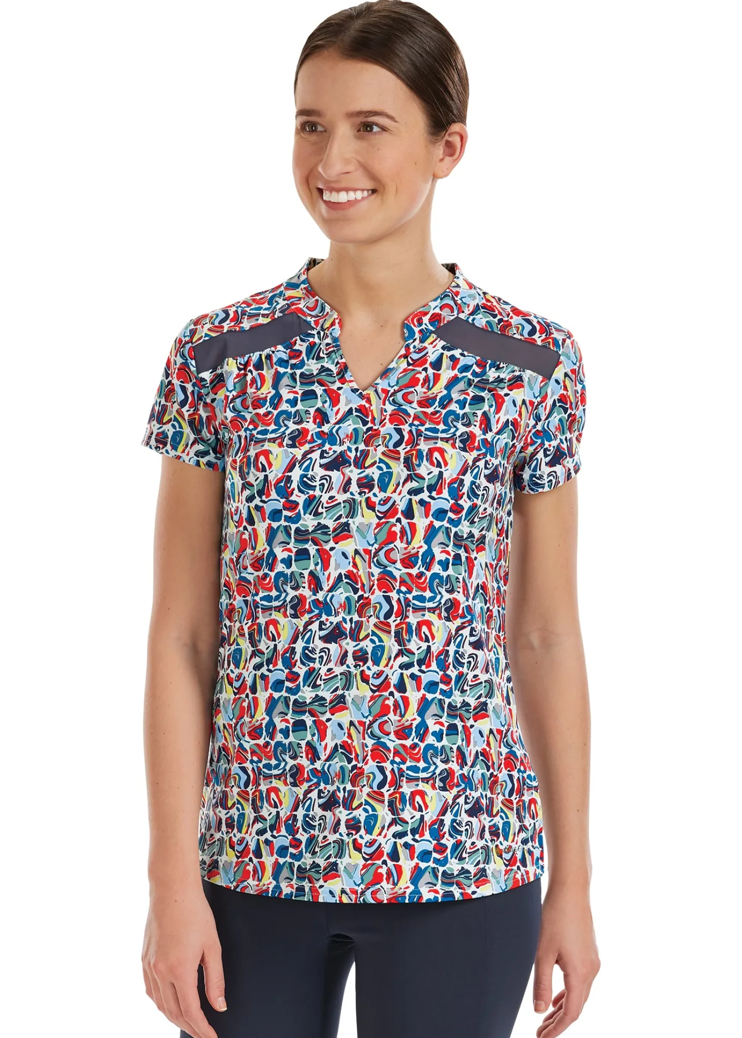 The Noble Equestrian™ Ladies’ Erin Mandarin Short Sleeve Print Top combines feminine touches with sporty performance. This lightweight stretch jersey with a stylish print features HeiQ Fresh Tech wicking and odor control technology and HeiQ Smart Temp cooling for your ultimate comfort and confidence. Power mesh inserts encourage cooling airflow.