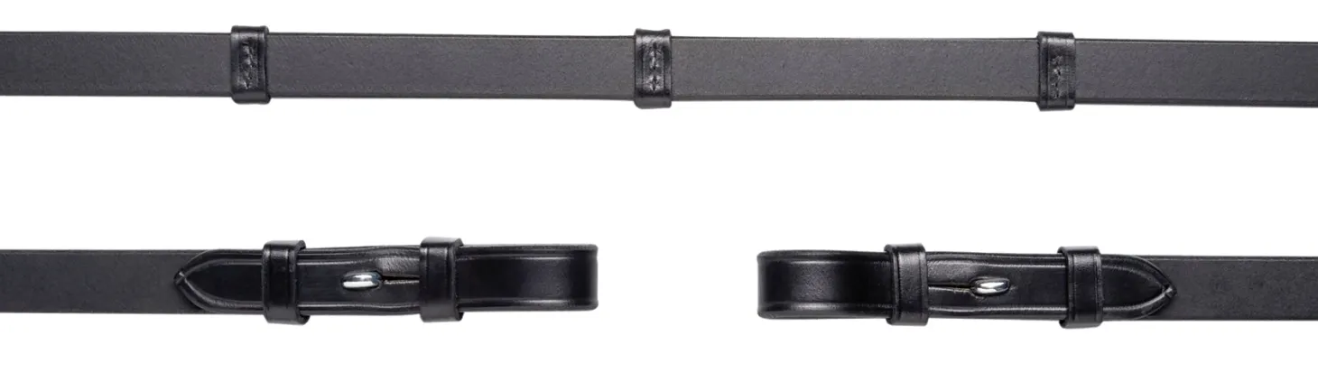 Schockemöhle Leather Reins with Hand Stops are a beautiful, durable choice in quality leather with hook stud ends. Black.