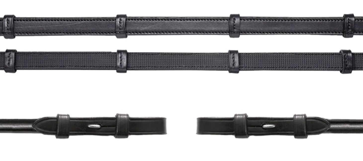 PRODUCT DESCRIPTION: Schockemöhle Rolled Leather Rubber-Lined Reins with Stops
