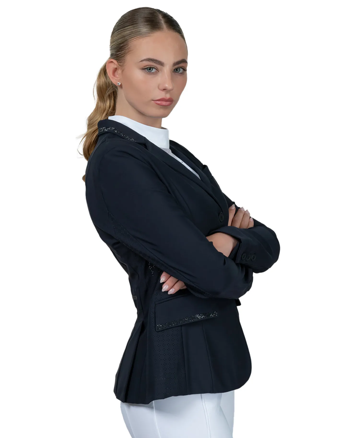 Fashionable, functional and ready to perform, the competition jacket has been elevated with the Schockemöhle Ladies’ SpAlaine Show Coat. Piped pockets with flaps and rhinestone decoration for a flattering look in the saddle, perforated side panels with dividing seams and back bar at the back. Walking slits, rhinestone decoration on the collar and back bar. Buttons and a concealed zipper close the jacket with a clean silhouette. Logo rubber badge on the sleeve announces Schockemöhle sophistication.