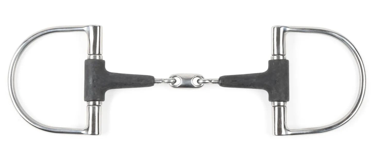 The Equikind+ Hunter Dee Bit with Lozenge has a 13mm three-piece mouthpiece with a thin rubber coating. The rubber makes it milder than a traditional metal bit as it softer on the horse’s bars and lips. The lozenge lies nicely on the tongue and offers mild tongue pressure. D-rings are a classic design that can assist with sideways stability in the mouth. Rings are 90mm.