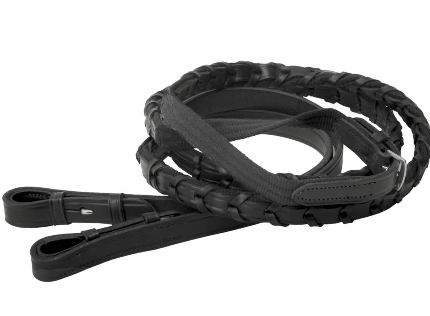 From Tory Leather Company, these 5/8″ x 54″ Cross Country Reins have bridle leather lacing over cotton web for a nonslip grip. Stainless steel center buckle and hook stud ends.