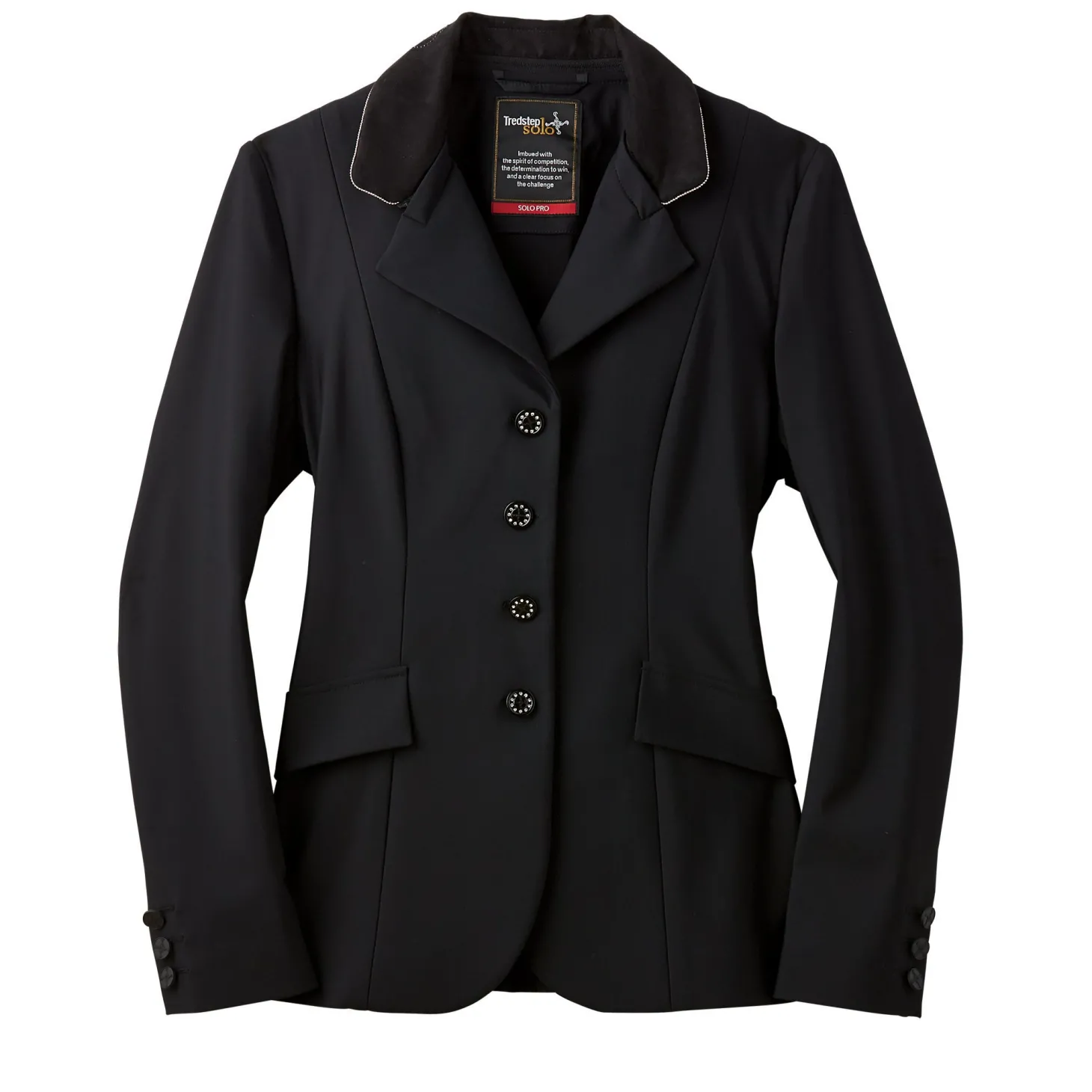 With the Tredstep™ Solo Dressage Collar Set, you can turn your Solo Pro Competition Coat into a high-performance dressage coat. This collar kit includes a black suede-like collar with black rhinestone embellishments and silver beading on the edge. It attaches to your coat with a zipper that virtually disappears. The set also comes with a set of reversible Solo branded buttons, giving you the option to create a specific look. One side of the buttons features four crystals and a silver beaded edge for a hint of bling; the other side has a black matte finish for a subtle look.