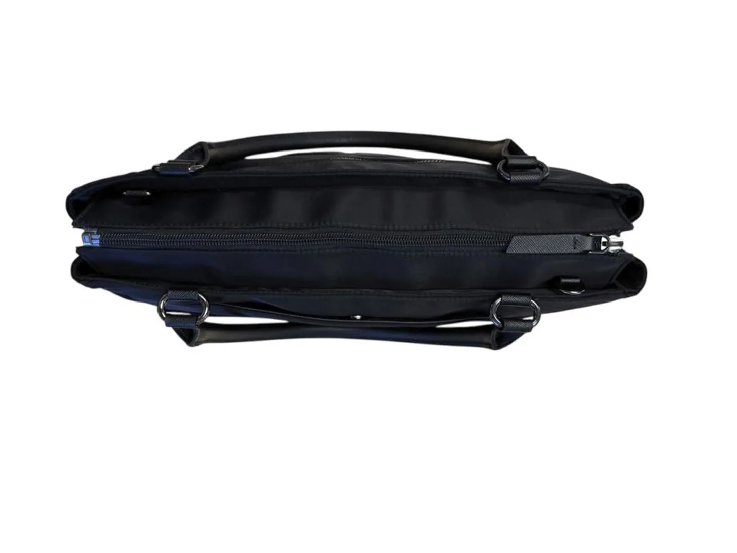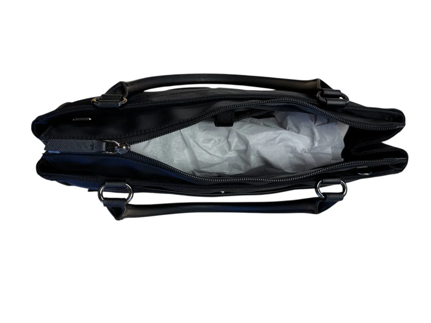 Carry your equestrian style to your work spaces and beyond in our Tucker Tweed Equestrian™ Large Office Tote. This nylon/leather upscale tote is a pocket powerhouse! Interior pockets for laptop, drink, phone, cords and more. Exterior completed with gunmetal hardware, matching zipper pockets both front/back and trolley sleeve. Includes adjustable shoulder strap. Fits 15″PC/16″ MacBook size laptop.