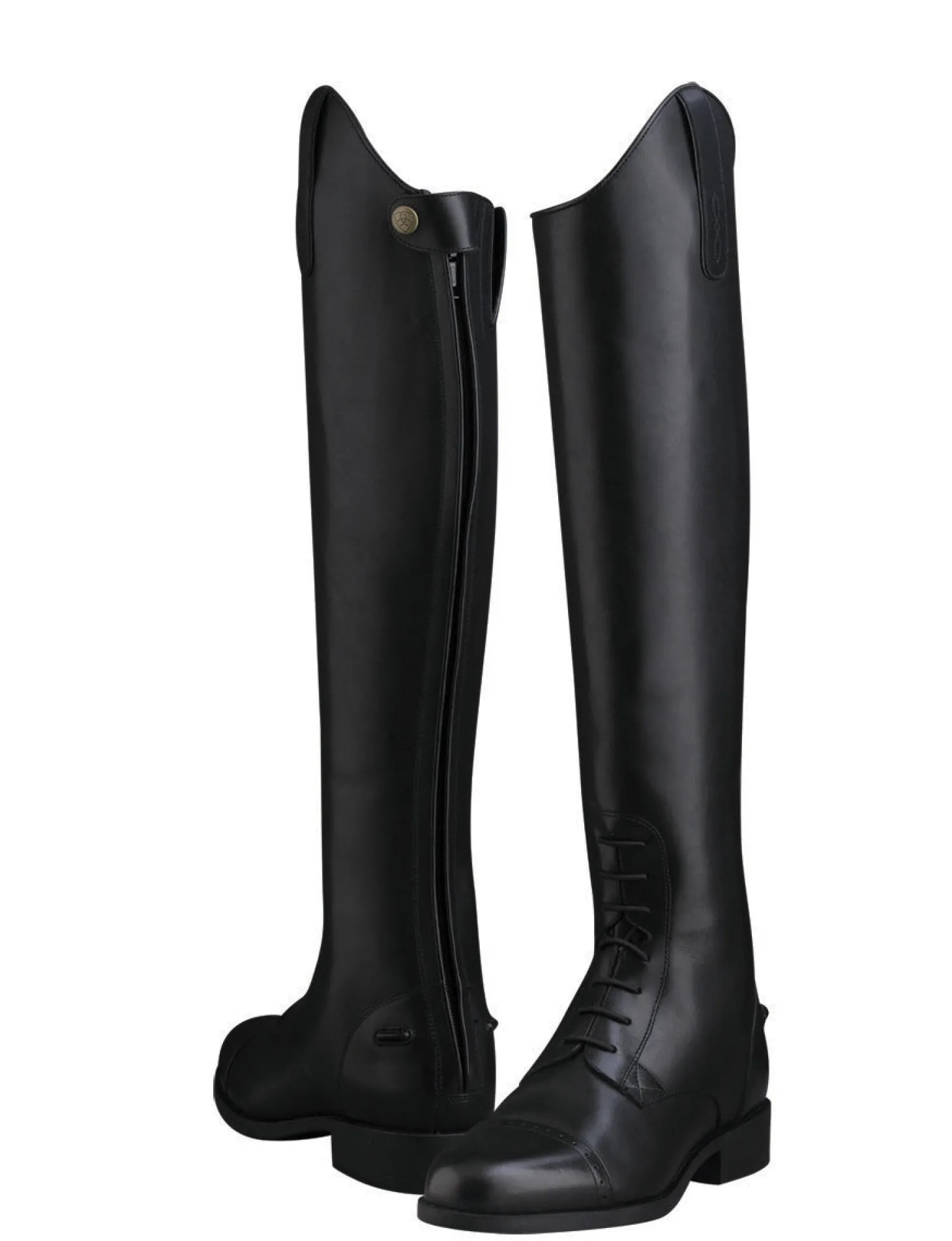 The Ariat® Ladies’ Challenge II Zip Field Boot – Short height offers elegance combined with comfort and durability. It flatters your leg with high-cut Spanish topline and contoured fit. Piping along the toe cap, top and swagger tab adds refinement and style. This tall riding boot has a fully-lined, European calf leather upper with an elastic gusset at the inside top to eliminate binding. ATS® technology reduces stress to feet, lower legs and back. Gel-cushioned insole and composite fiber forked shank offer maximum stability. Duratread™ outsole provides traction while built-in spur rests keep your spurs in place. A full-length, heavy-duty, premium, coiled rear zipper and elastic laces allow easy on and off.
