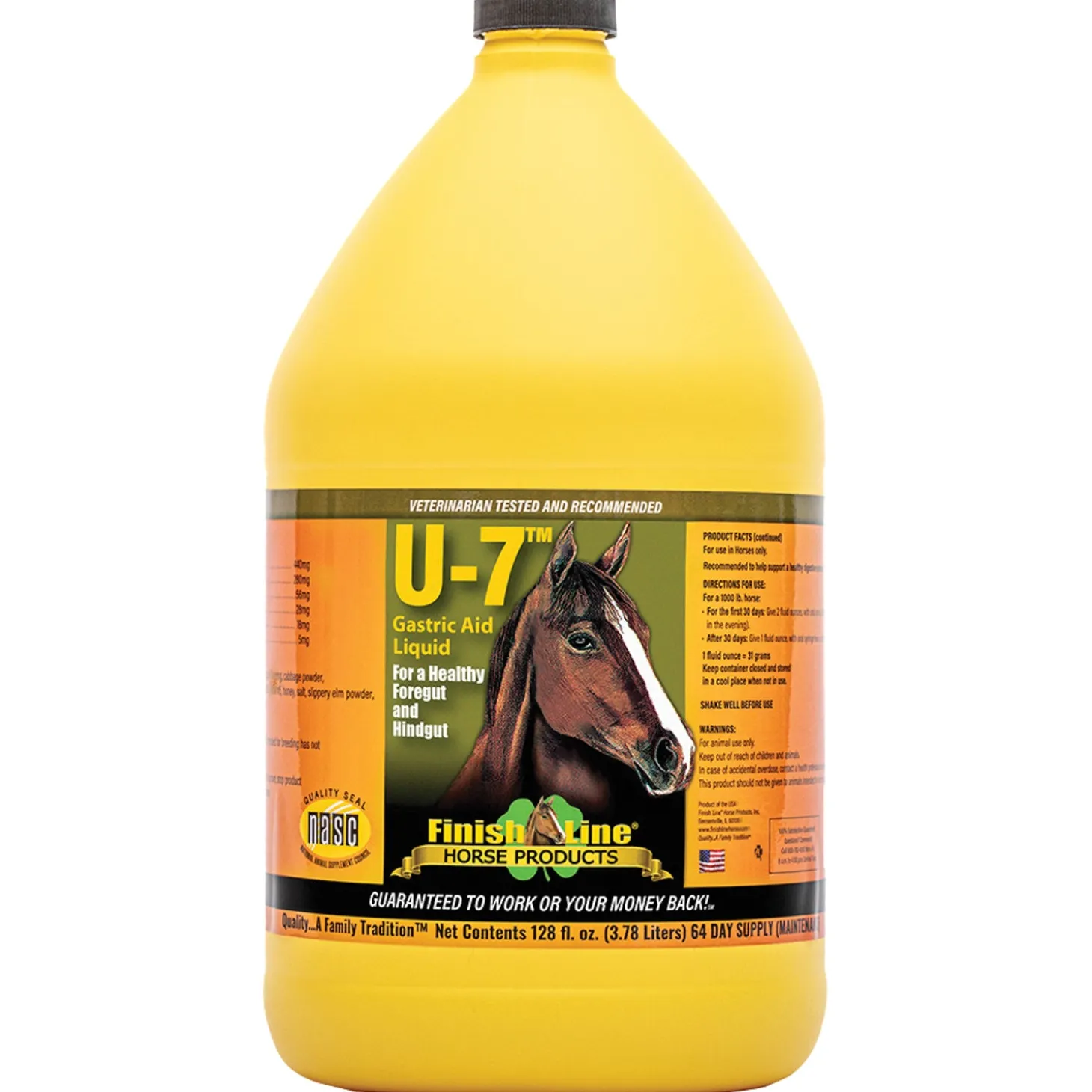 Finish Line® U-7 Gastric Aid™ Liquid for horses and ponies is designed to help promote a healthy digestive system, including the foregut and hindgut. Made in the USA, U-7 Gastric Aid is a clinically studied, vitamin/herbal blend with all-natural ingredients. It helps maintain a healthy coat and body weight, encourages a healthy appetite, promotes a soothing stomach, supports healthy digestion, helps to maintain normal gut flora and promotes normal manure.