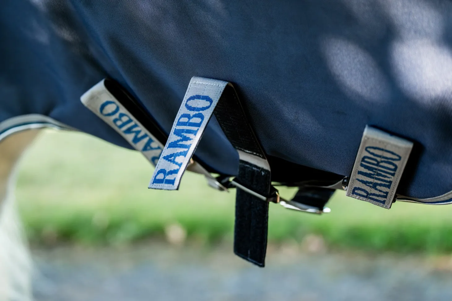 Other features include a contoured detachable hood for greater blanketing options, integrated liner loops for full compatibility with the extensive liner collection, reflective strips, wipe clean tail cord, and three crossed removable surcingle straps integrating the Rambo® Safety Surcingle System.