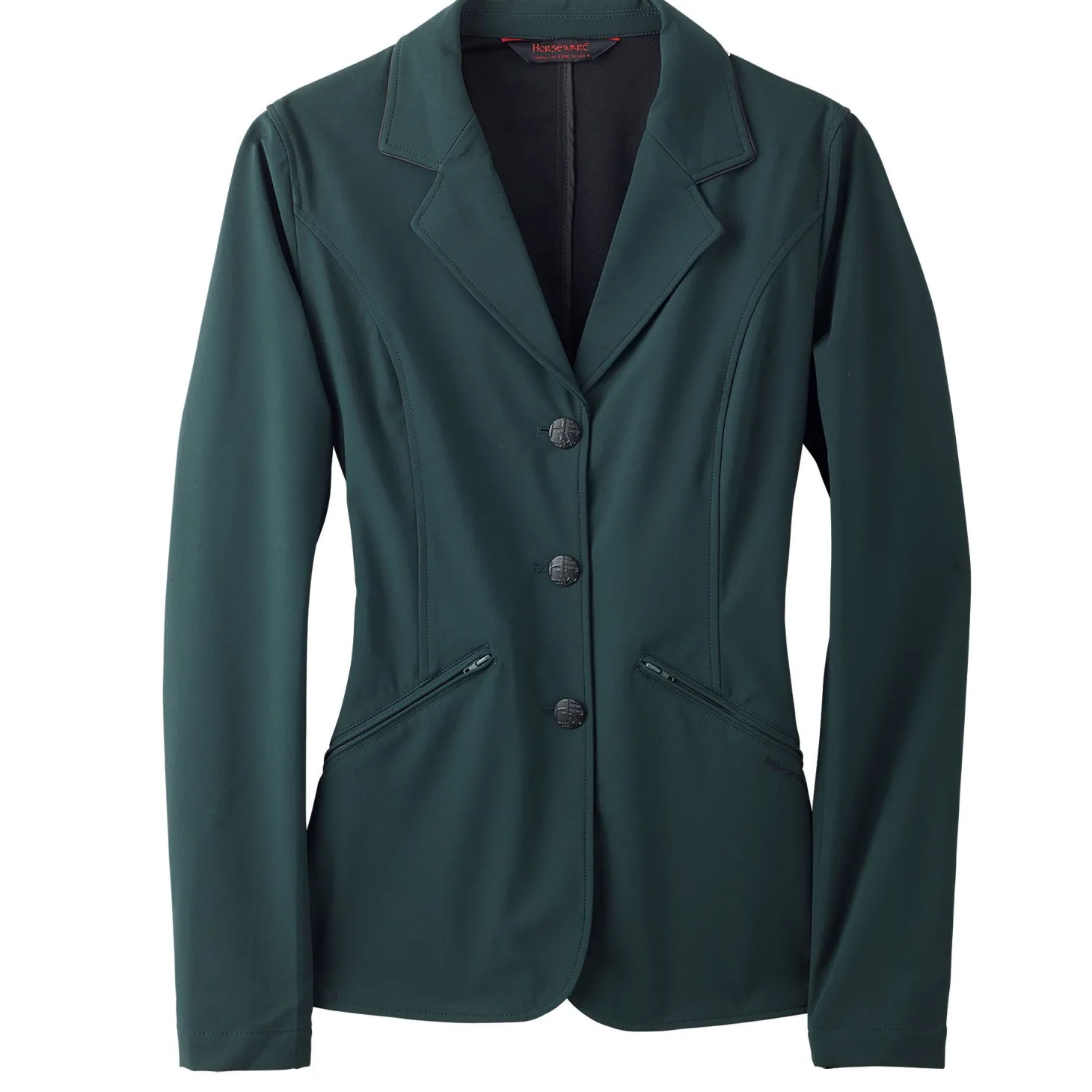 The Horseware® Ladies’ Competition Coat is light, stretchy and easy-care. Waterproof, breathable softshell material has classic three-button front styling with Horseware’s signature brand buttons. Front slant pockets stay neatly closed with subtle zippers and Horseware branded zipper pulls.