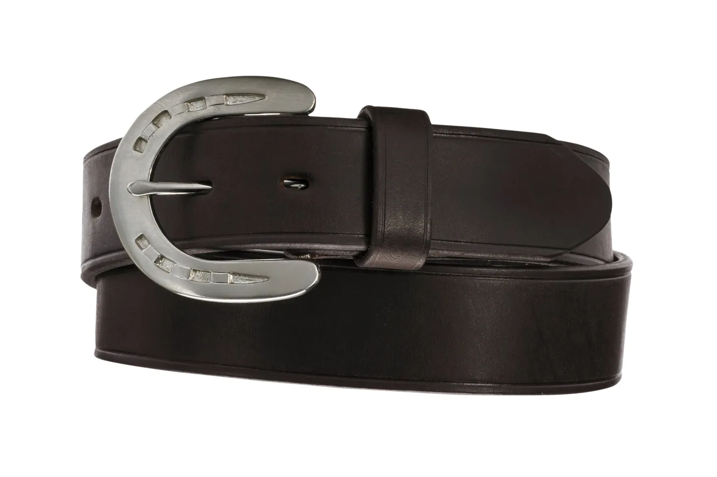 Invite extra luck and equestrian flair into your look! This Horseshoe Good Luck Belt is crafted from a strap of leather and fitted with a nickel buckle in the shape of a horseshoe. 1 1/4″ wide with seven adjustment holes.