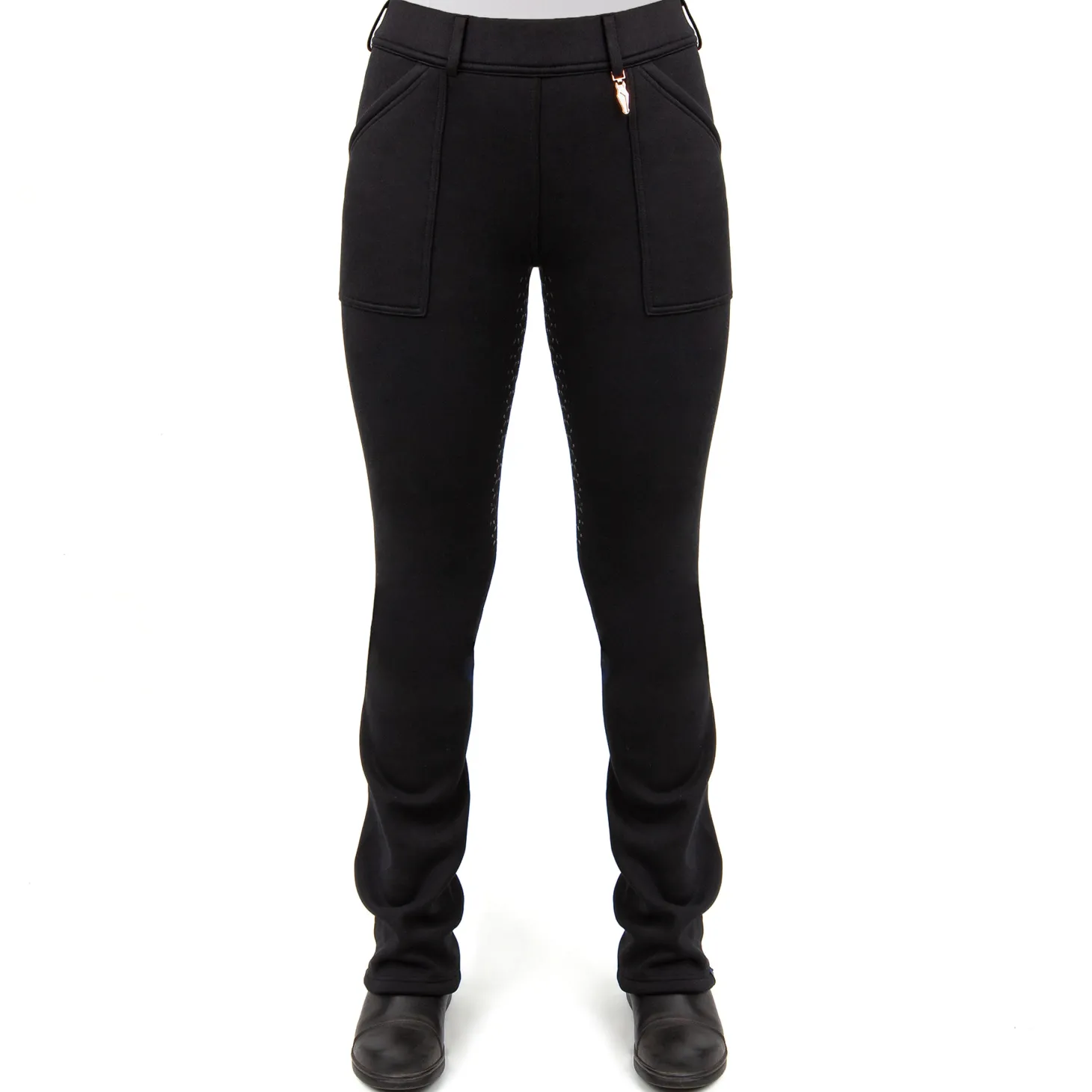 The Irideon® Fjord Fleece Half-Seat Bootcut Breech feels ultra-plush and warm. Designed to block wind and cold, it has all-way stretch to allow unrestricted movement. Extra-large front pockets accommodate even the largest cellphone. Belt loops and a rose-gold horsehead charm add a touch of polish.
