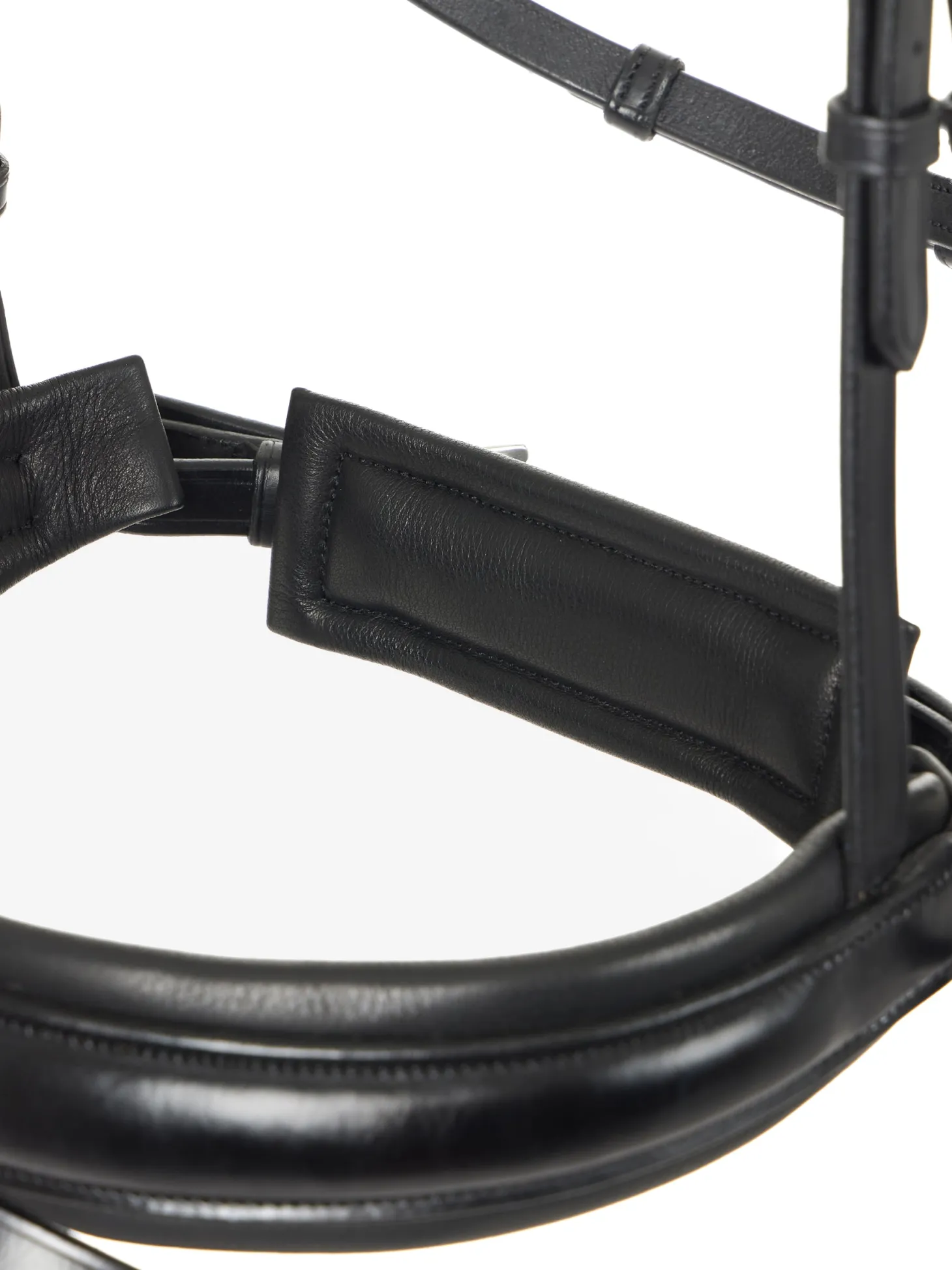 The delicate, beautifully sculpted clincher browband is easily detachable with popper closures. The statement crank noseband is fully cushioned and equipped with a roller buckle, as is the flash strap. Throatlatch secures discreetly with one buckle under the jaw.