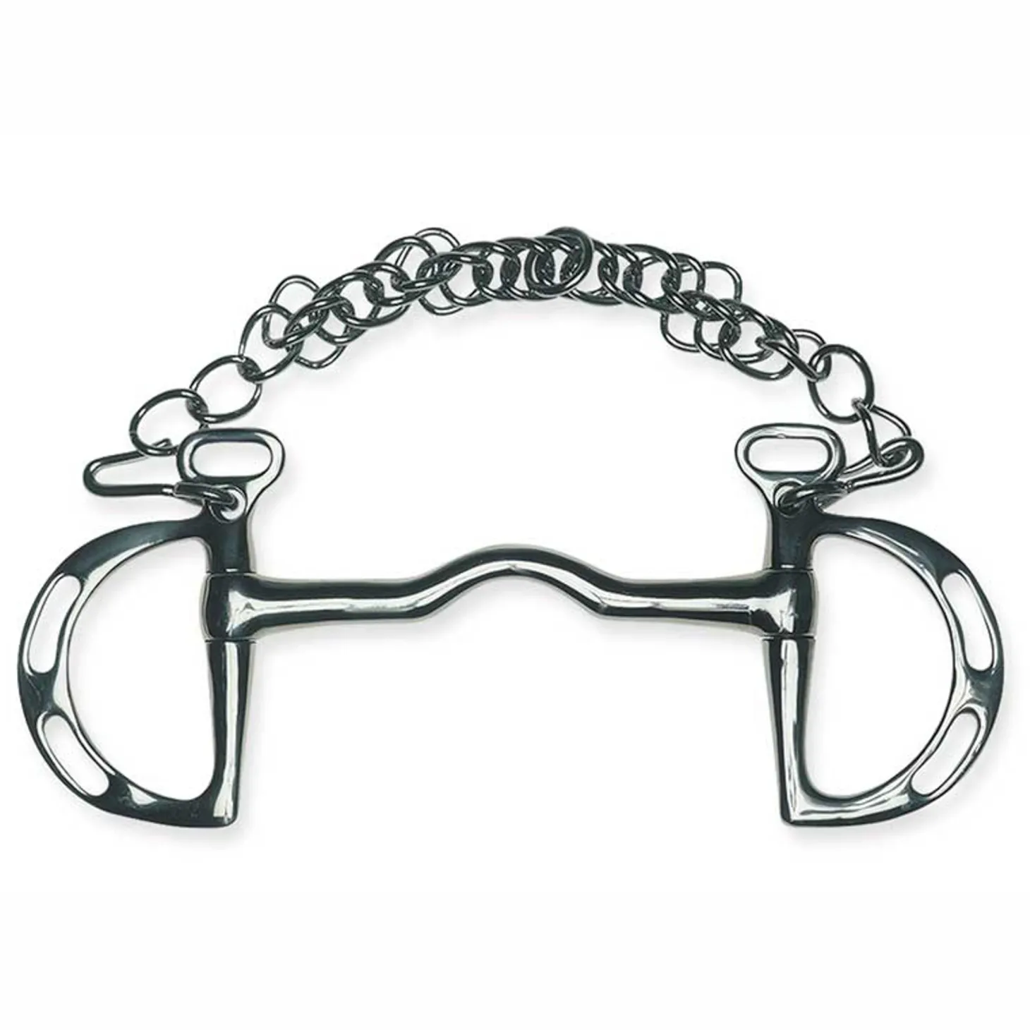 Made of solid stainless steel, this Metalab Solid Low Port Kimberwick is a Level 3 bit. Mouthpiece features a low port. Slotted cheeks. Includes curb chain and hooks.