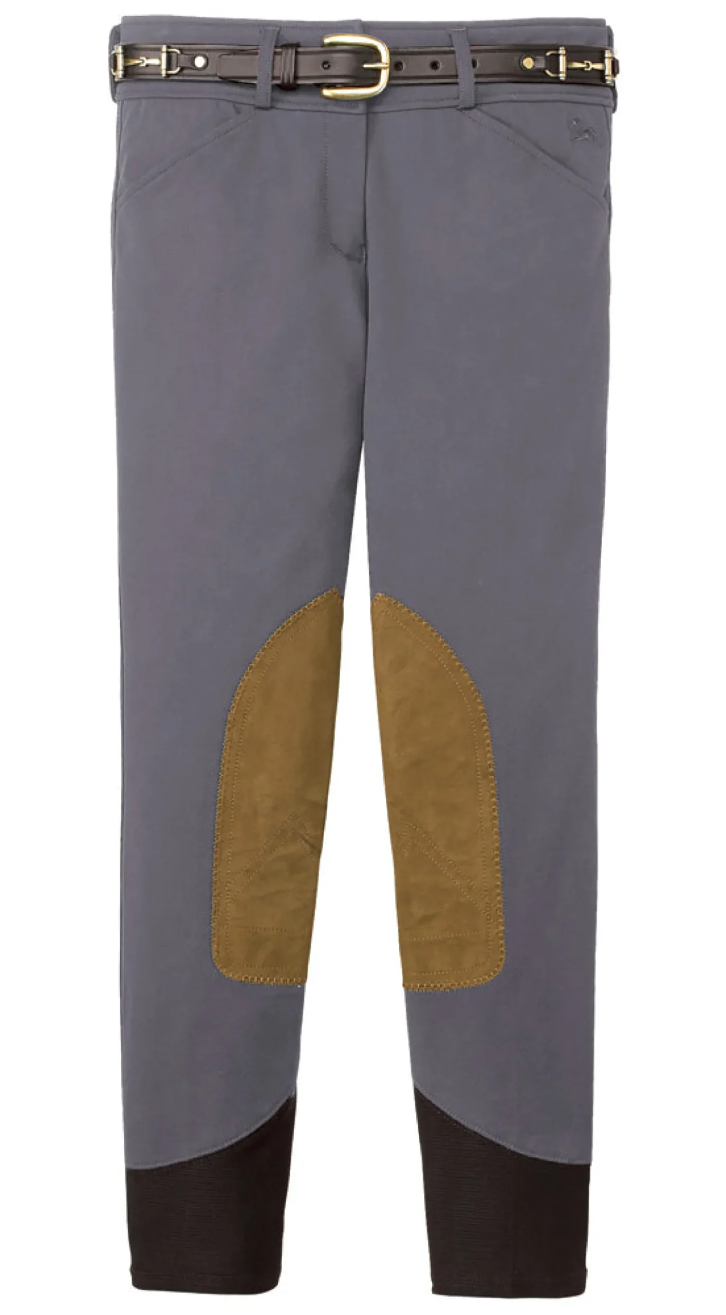 Supple Clarino™ knee patches present the look of suede, but withstand the intense abrasion expected from equestrian sport. The Gulf’s Euro seat design includes mesh lower leg panels that are soft and sleek inside boots. R.J. details on front closures and pockets complete this design.