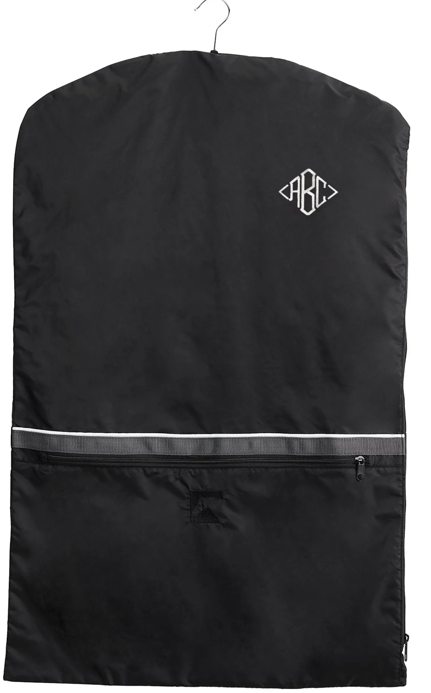 Port at the top lets clothes hangers poke through. Full-width front pocket provides storage for riding gloves, boot socks and other accessories. Side zipper allows access to the interior. Easily embroidered with your name or monogram.