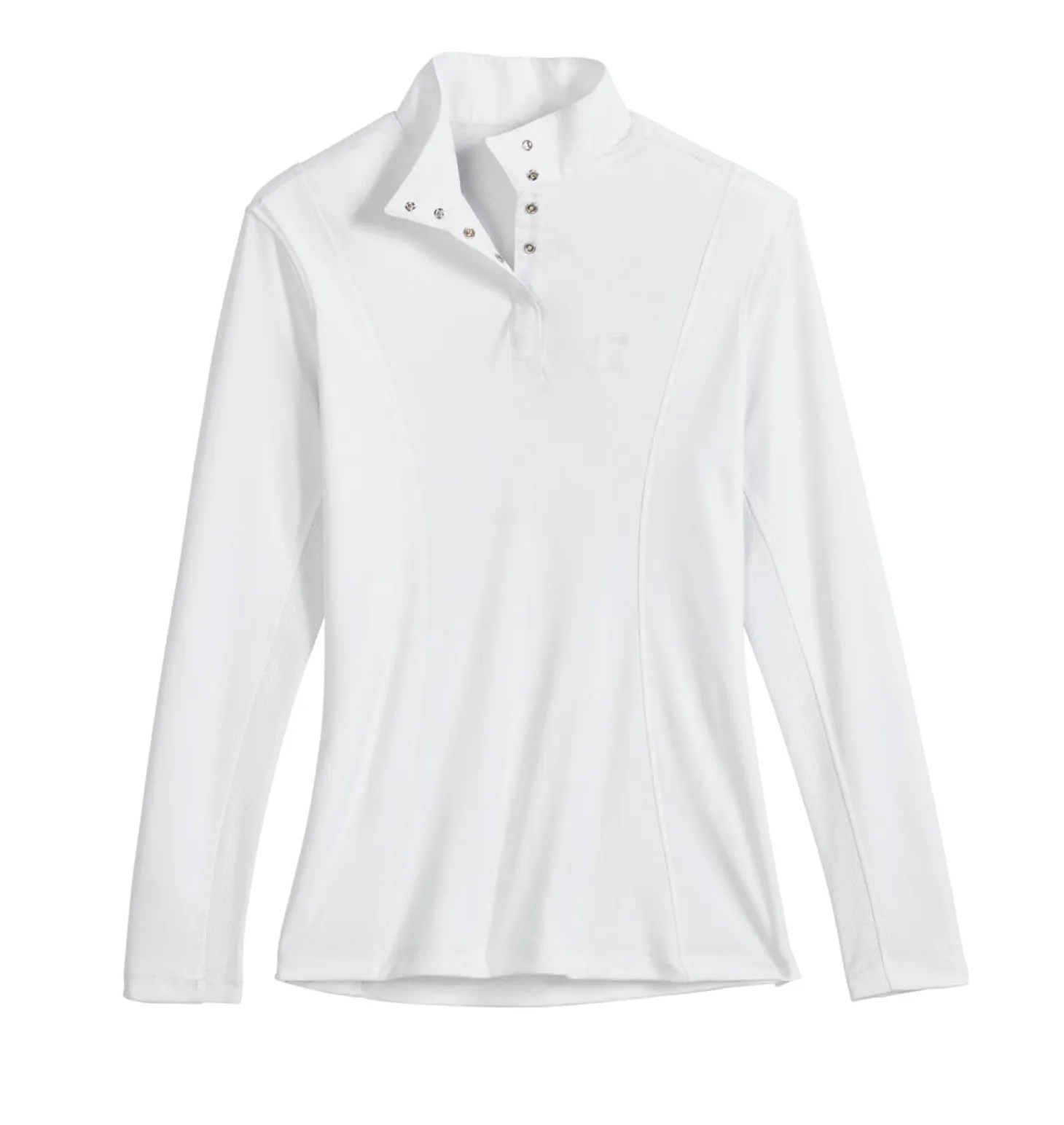 Every competitor can wear the Riding Sport™ Essential Long Sleeve Show Shirt in any discipline. This show-day staple in crisp and classic white offers a flattering fit. The body in lightweight interlock knit rated UPF 50+ wicks perspiration and dries fast.