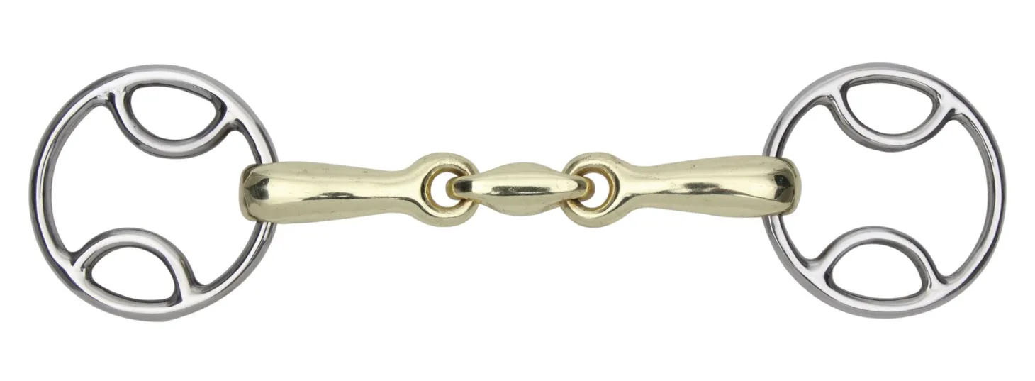 Shires Beval Bit with Lozenge allows mild leverage. A brass alloy mouthpiece aids salivation. Gentle rounded lozenge prevents the nutcracker effect of a single-joint bit. Mouthpiece thickness is 16mm; cheek height is 55mm (5″), 70mm (5.5″).