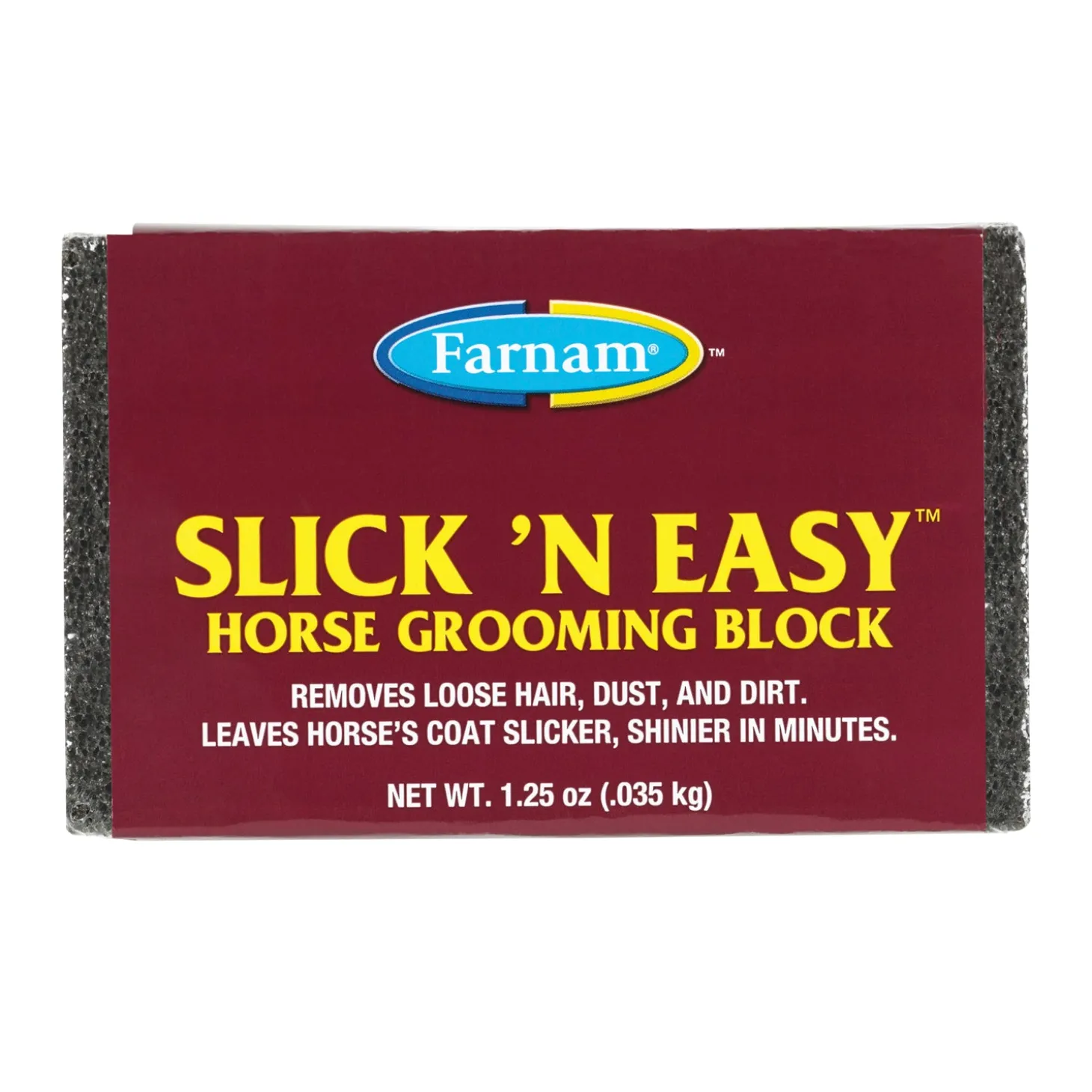 The Slick ‘N Easy™ Horse Grooming Block from Farnam® removes shedding hair, dirt and dust from your horse’s coat and leaves a slick and shiny finish. Made of fiberglass, this grooming tool is also effective for removing bot eggs.