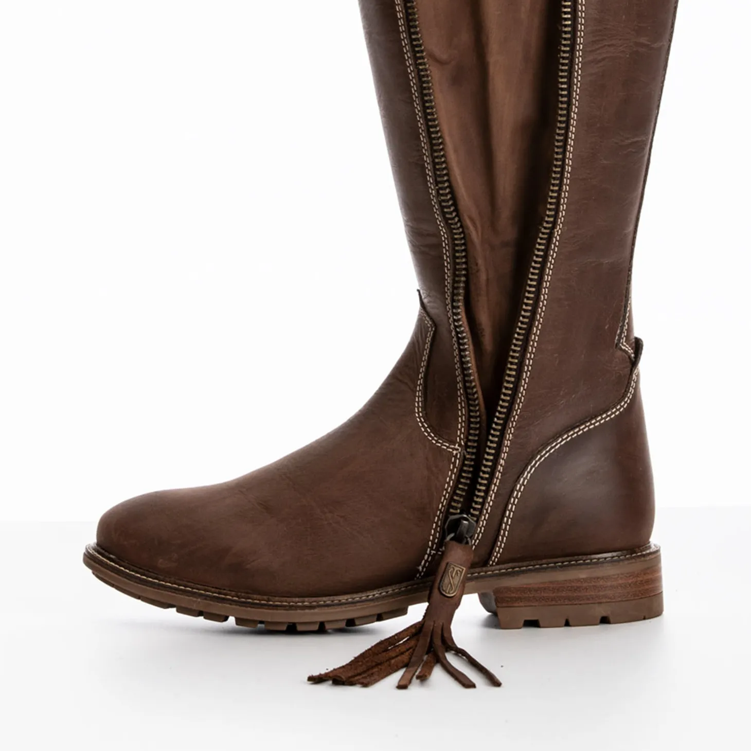 The Tredstep™ Shannon Winter Fur H20 Tall Country Boot offers waterproof comfort to the top of the side gusset. Made of sumptuous, oiled nubuck leather, it is fully lined with cozy faux fur and fitted with a cushioned, moisture-wicking footbed. A full outside brass zipper and gusset allows easy on and off. An all-terrain outsole adds traction.