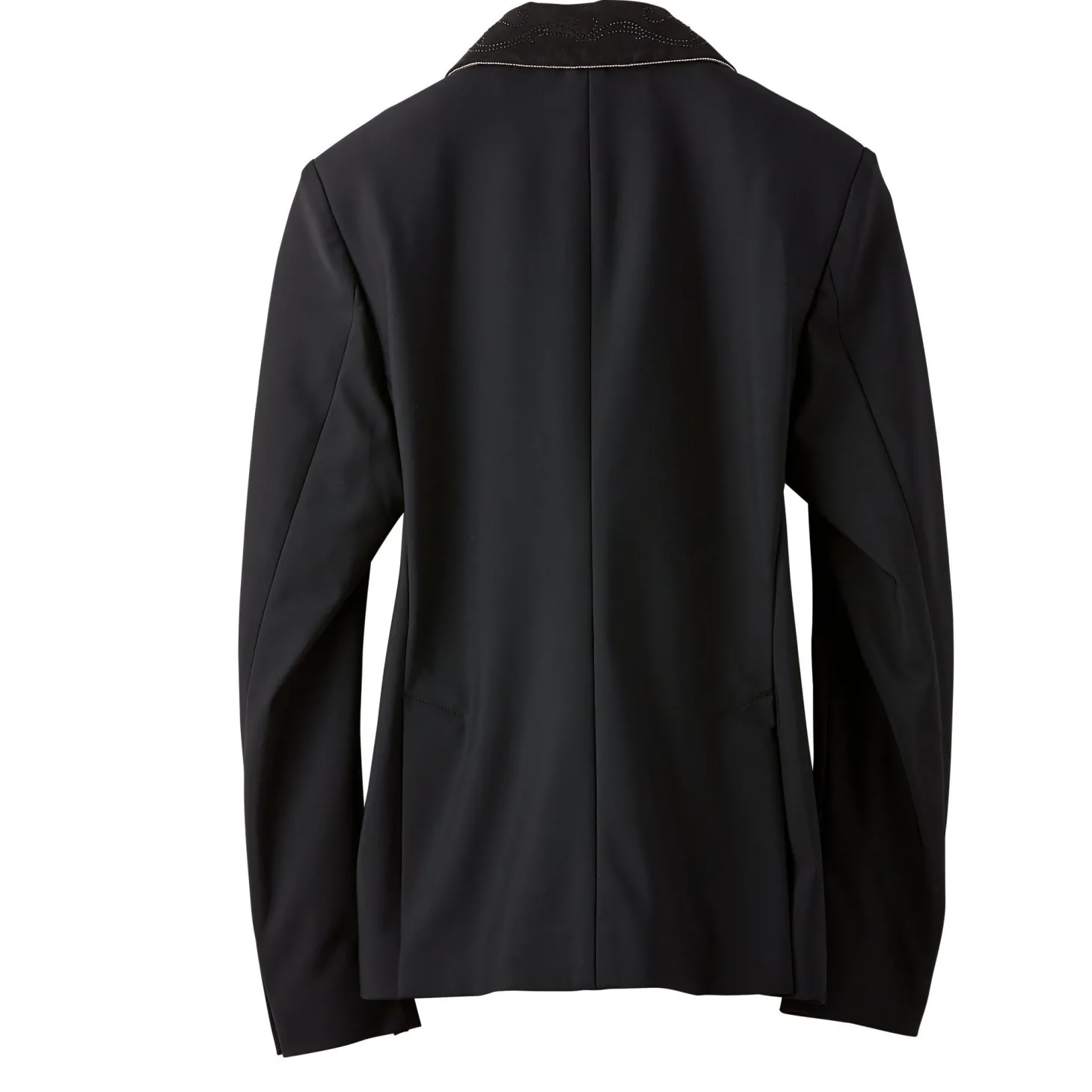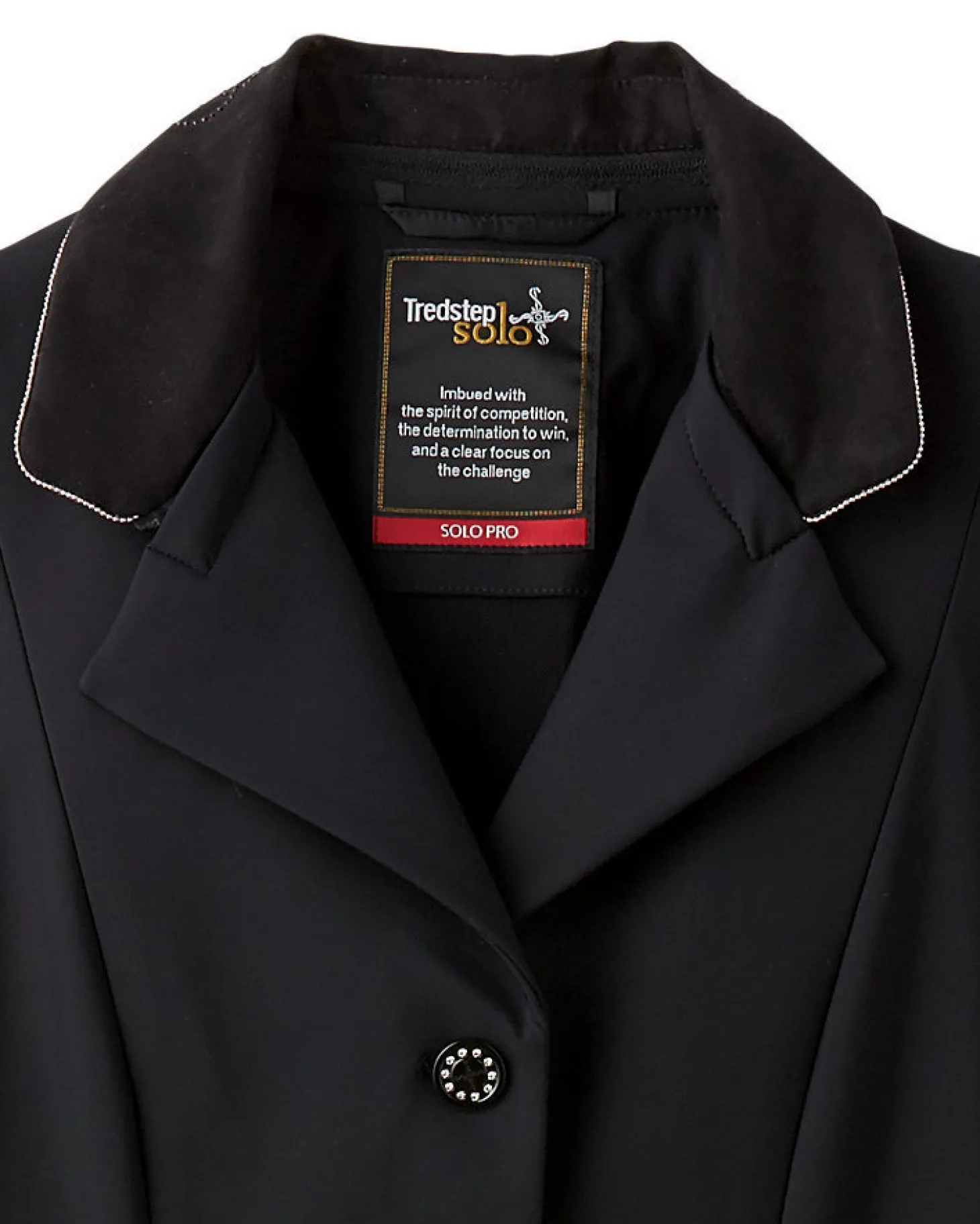 With the Tredstep™ Solo Dressage Collar Set, you can turn your Solo Pro Competition Coat into a high-performance dressage coat. This collar kit includes a black suede-like collar with black rhinestone embellishments and silver beading on the edge. It attaches to your coat with a zipper that virtually disappears. The set also comes with a set of reversible Solo branded buttons, giving you the option to create a specific look. One side of the buttons features four crystals and a silver beaded edge for a hint of bling; the other side has a black matte finish for a subtle look.