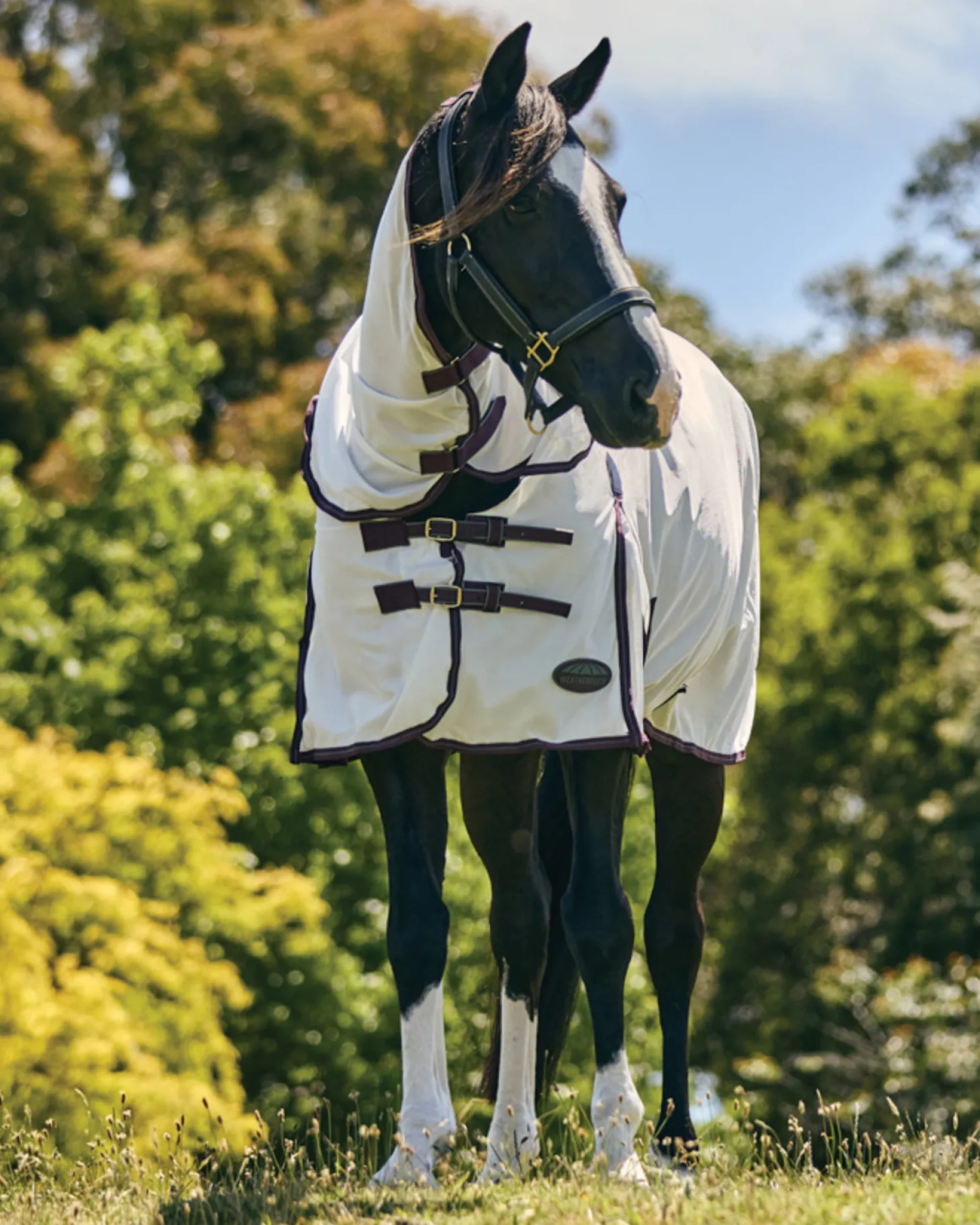 The WeatherBeeta® ComFiTec™ Essential Mesh II Combo Neck in soft mesh offers protection against flies. This sheet is breathable, cool and blocks 65% of ultraviolet rays. A 210T nylon lining at the shoulders, mane and tail help to protect hair, while traditional side gussets allow natural movement.